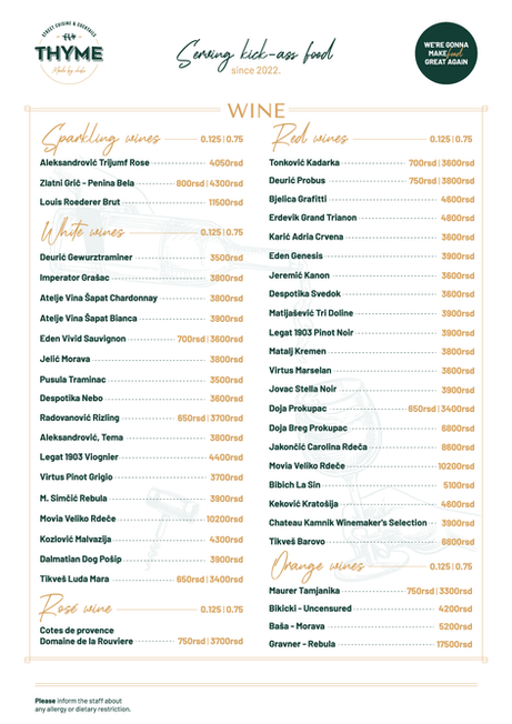 Menu for caterers